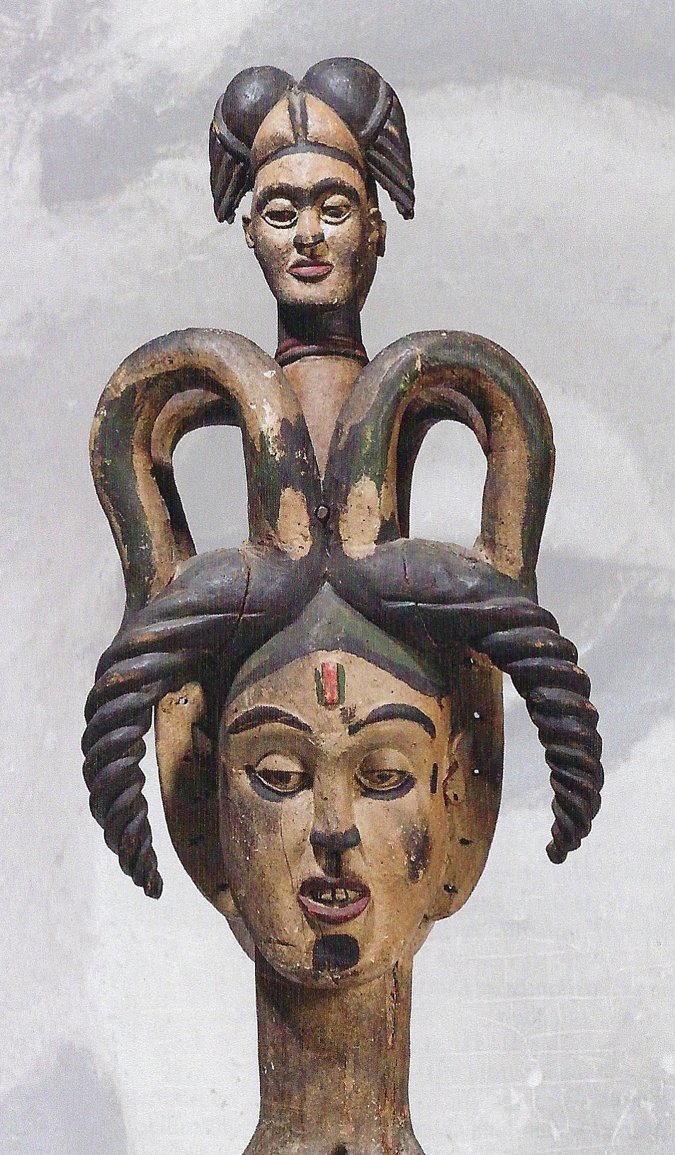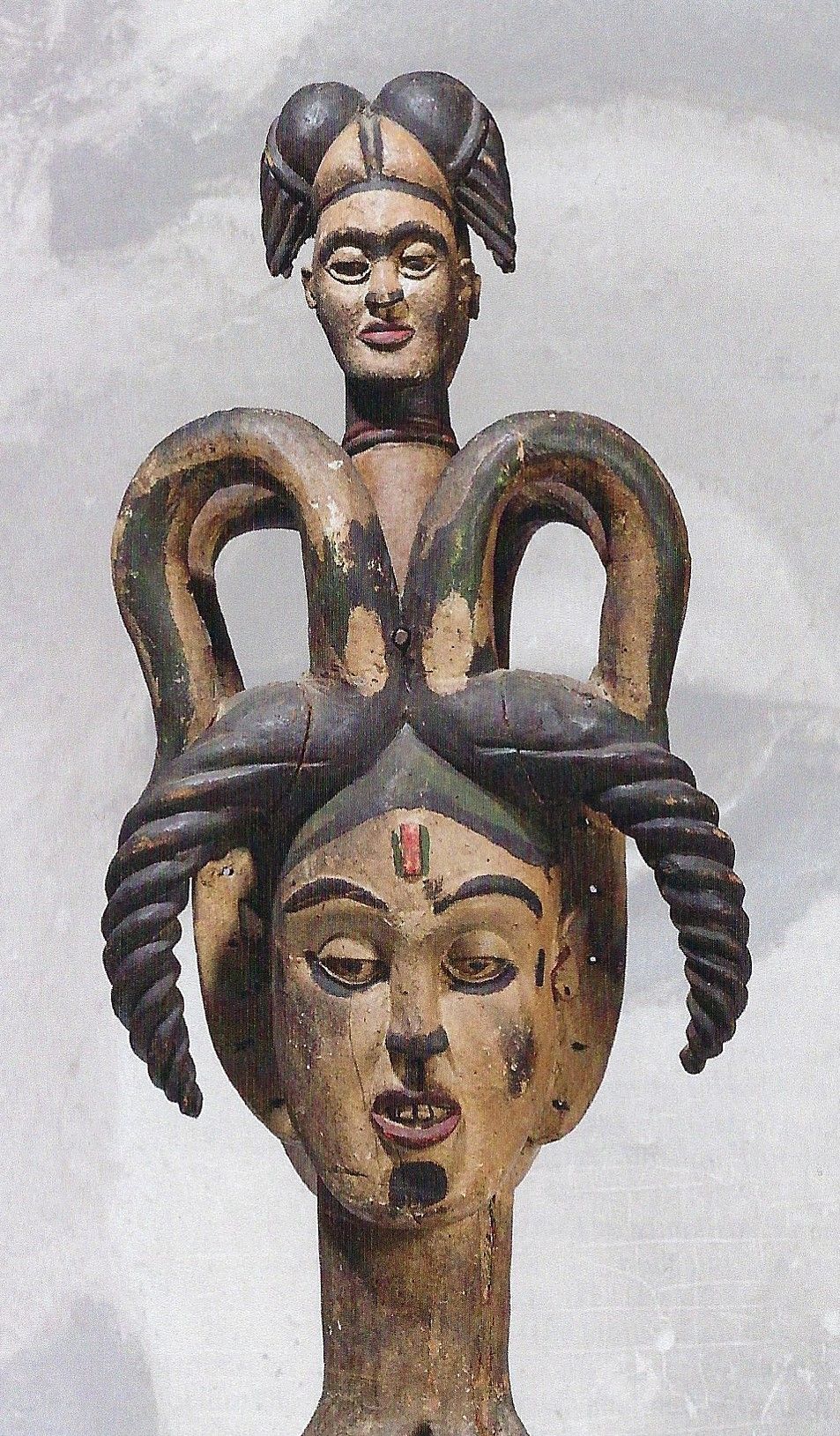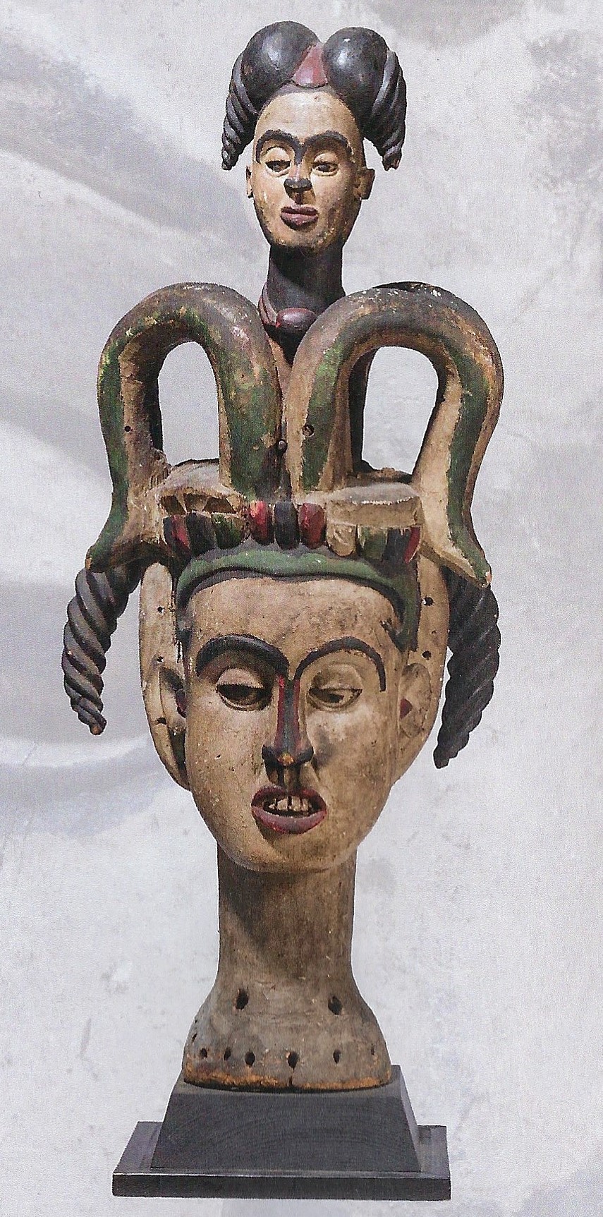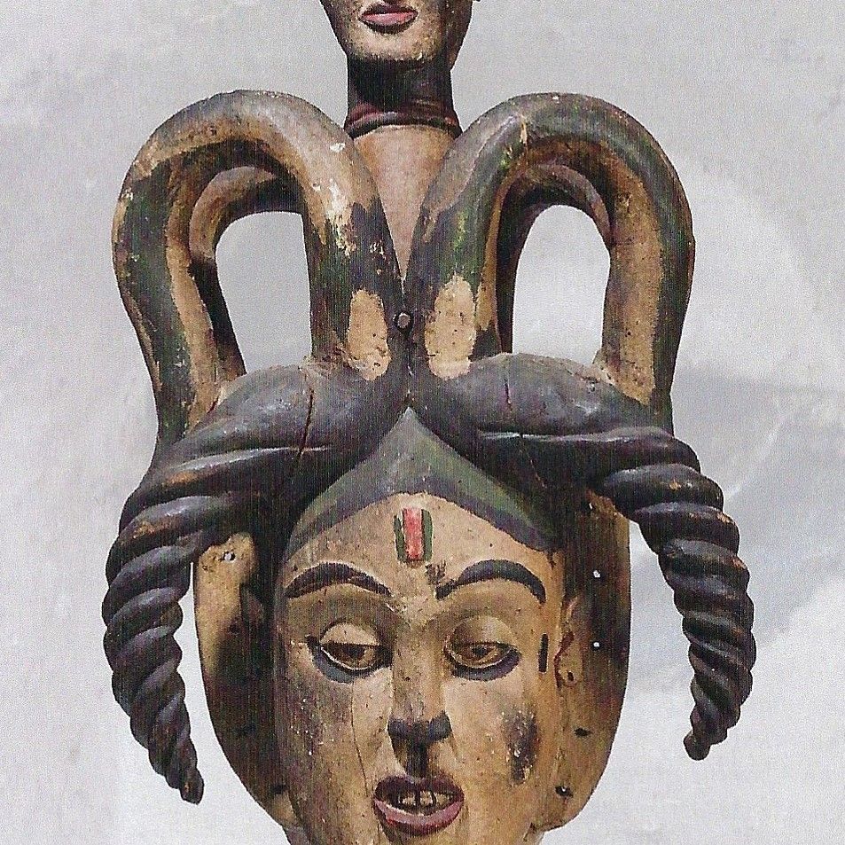 Polychrom gefasste, hölzerne Tanzaufsatzmaske in Form von Janusköpfen. Vorder- und Rückseite zeigen zwei unterschiedlich geformte Gesichter, eines mit aufwendiger Haarfrisur. Beide haben einen hornartigem Aufputz, darüber zwei weitere, ähnlich gestaltete, kleinere Gesichter