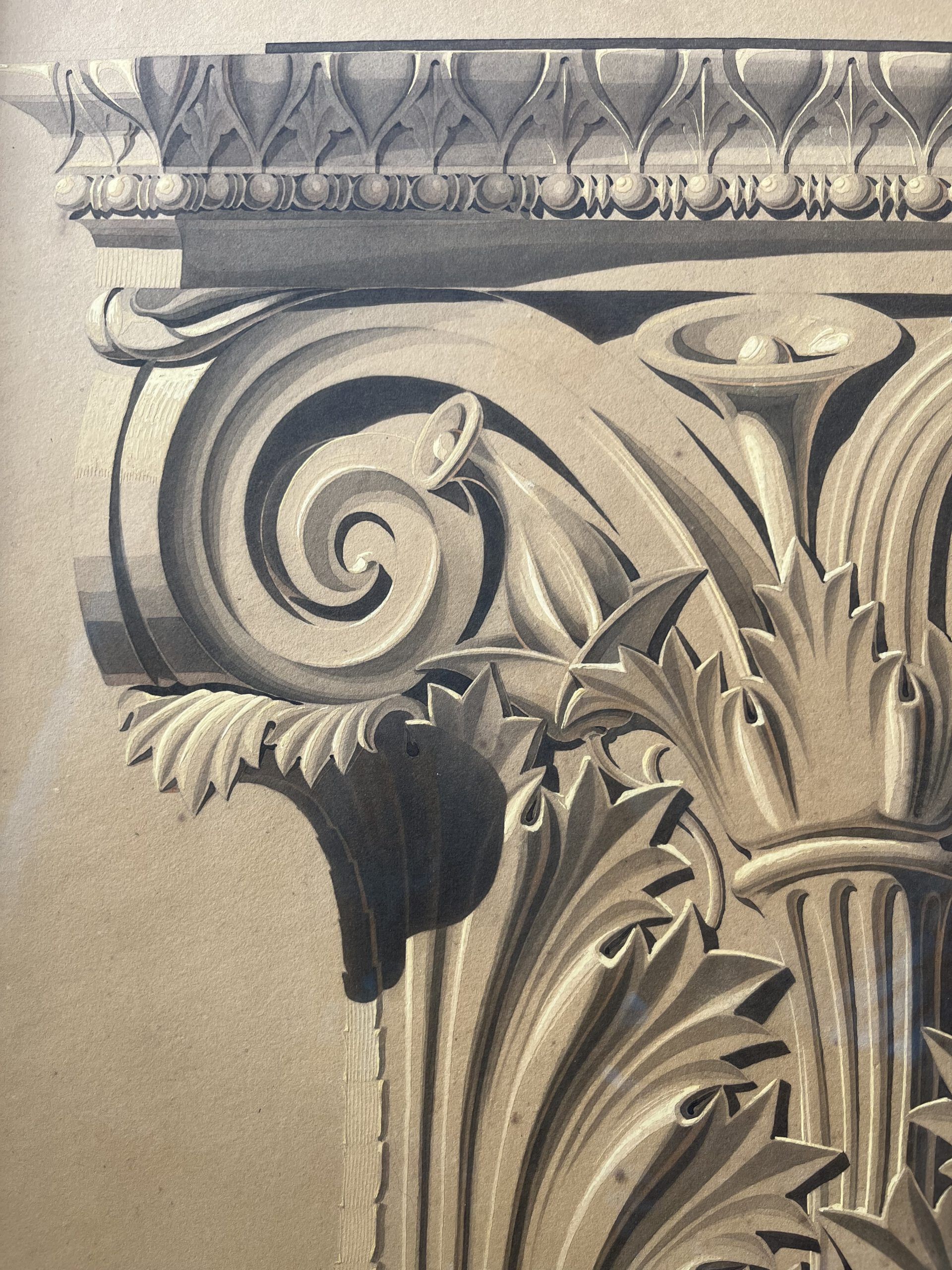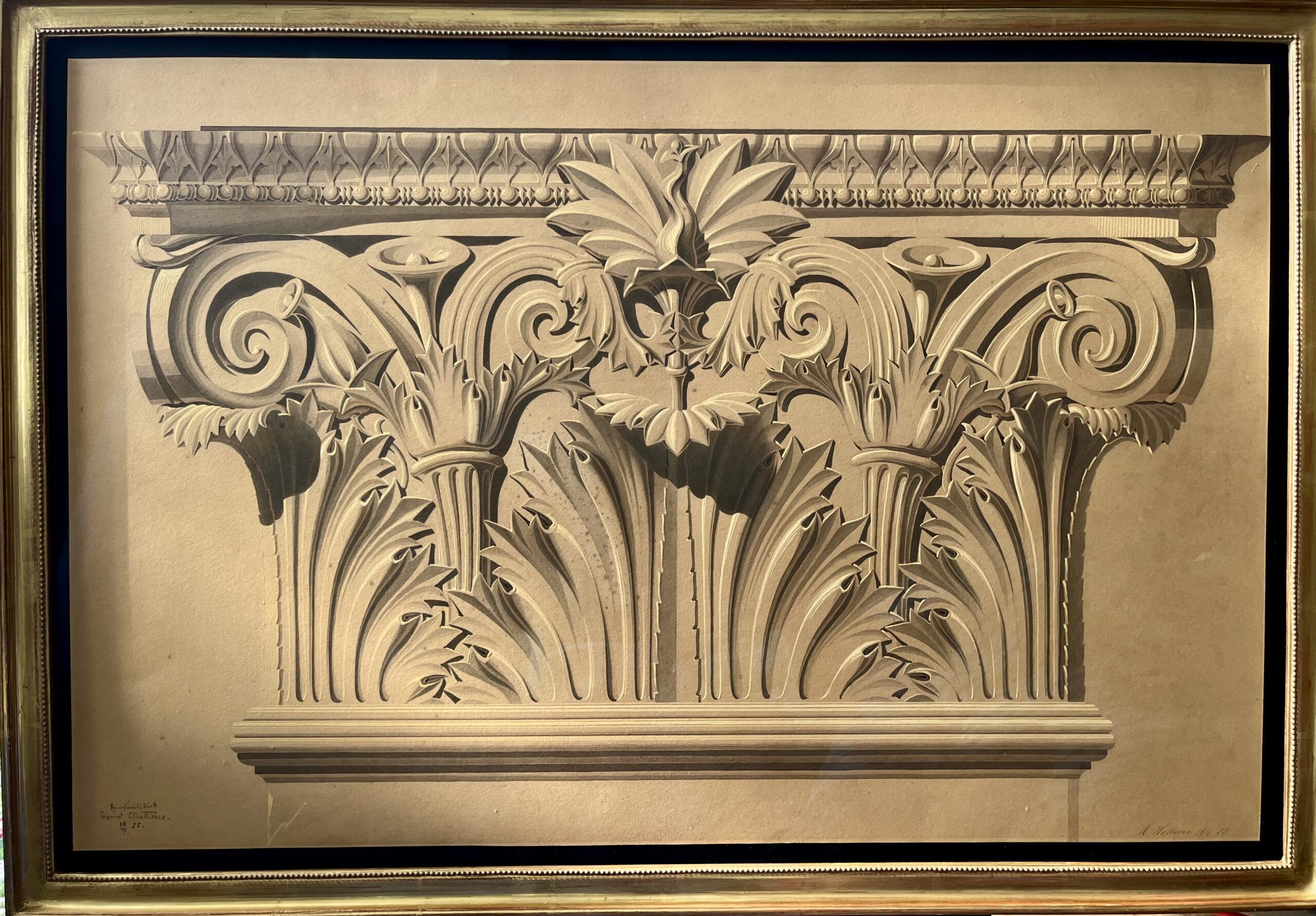 Für Architekturstudenten der Berliner Bauakademie stand Zeichnen auf dem Lehrplan. Pensums-Blatt steht links unten auf der großartigen Gouache, die am 18.7.1855 von C. Boetticher bezeugt, d. h. abgenommen wurde. Karl Boetticher (1808-1889), Architekturtheoretiker, Autor verschiedener Ornament- und Lehrbücher zur Baukunst unterrichtete 36 Jahre lang an der Berliner Bauakademie. H. Holbein, der die Zeichnung zur Prüfung einreichte, war ein talentierter Zeichner.
