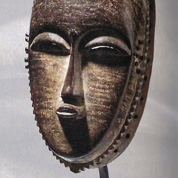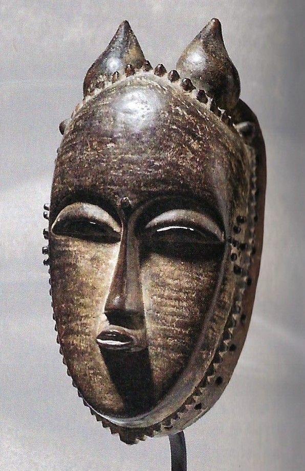 Fein geschnitzte Maske eines menschlichen Gesichts mit stark geschwungenen Augenbrauen und summarisch dargestellten Narbentatauierungen am Rand, in den Augenwinkeln und über der Nasenwurzel. Oberhalb der Stirn zwei kurze geschwungene Hörner