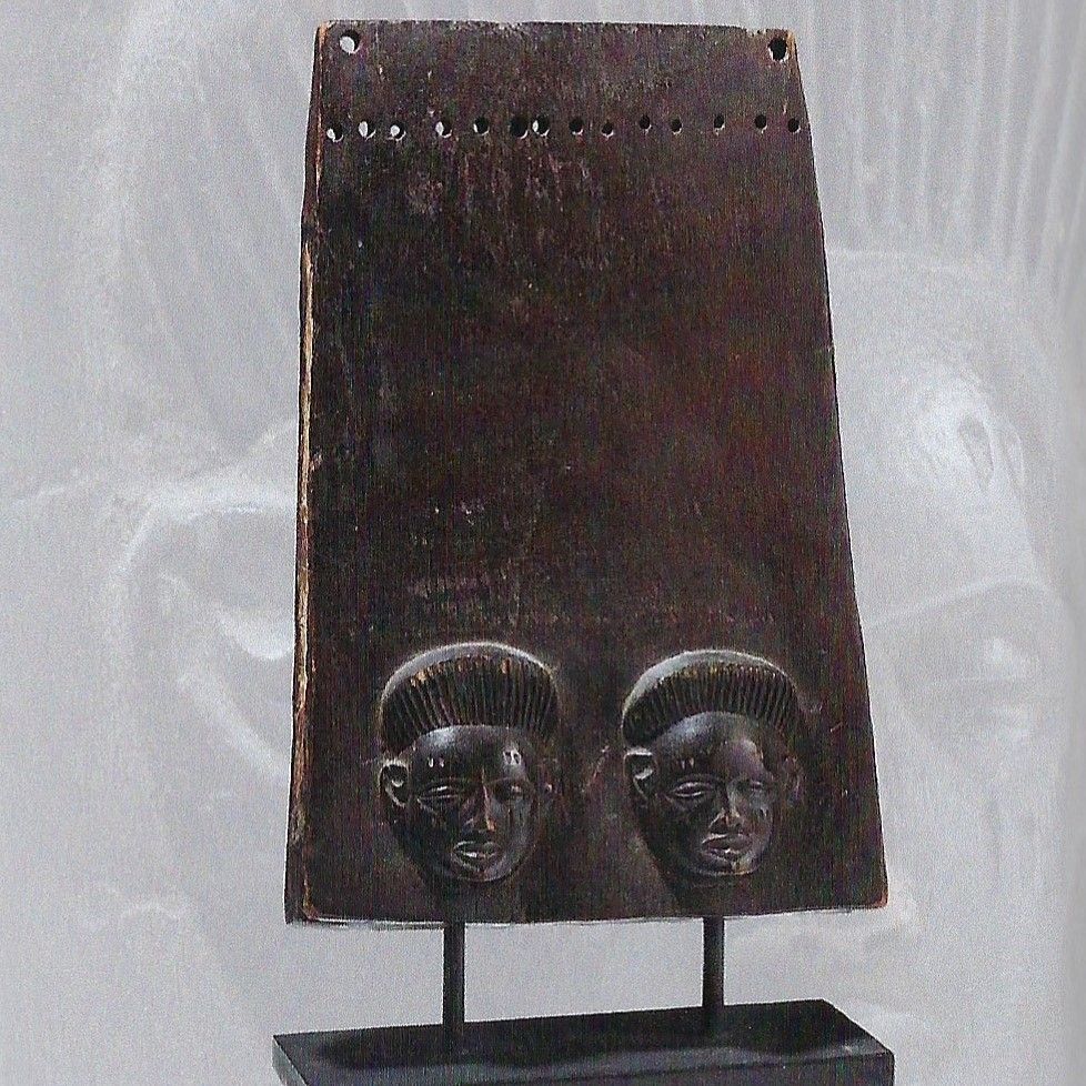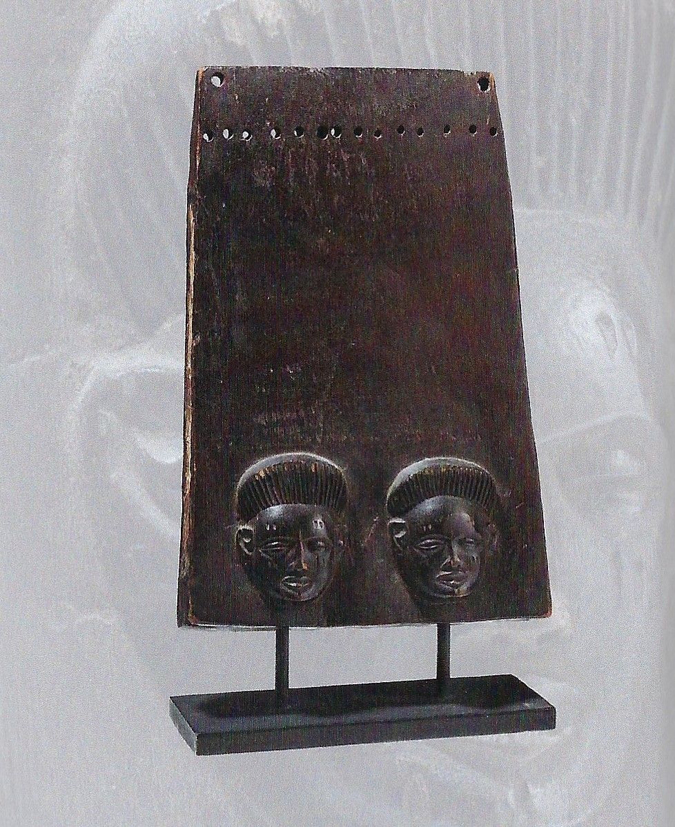 Trapezförmiges, hohl gearbeitetes Griffbrett aus dunklen, schweren und schön patinierten Holz mit kleiner Schallöffnung auf der Rückseite und mit zwei fein geschnitzten Maskaronen auf der Vorderseite dekoriert. (Klangzungen fehlen)