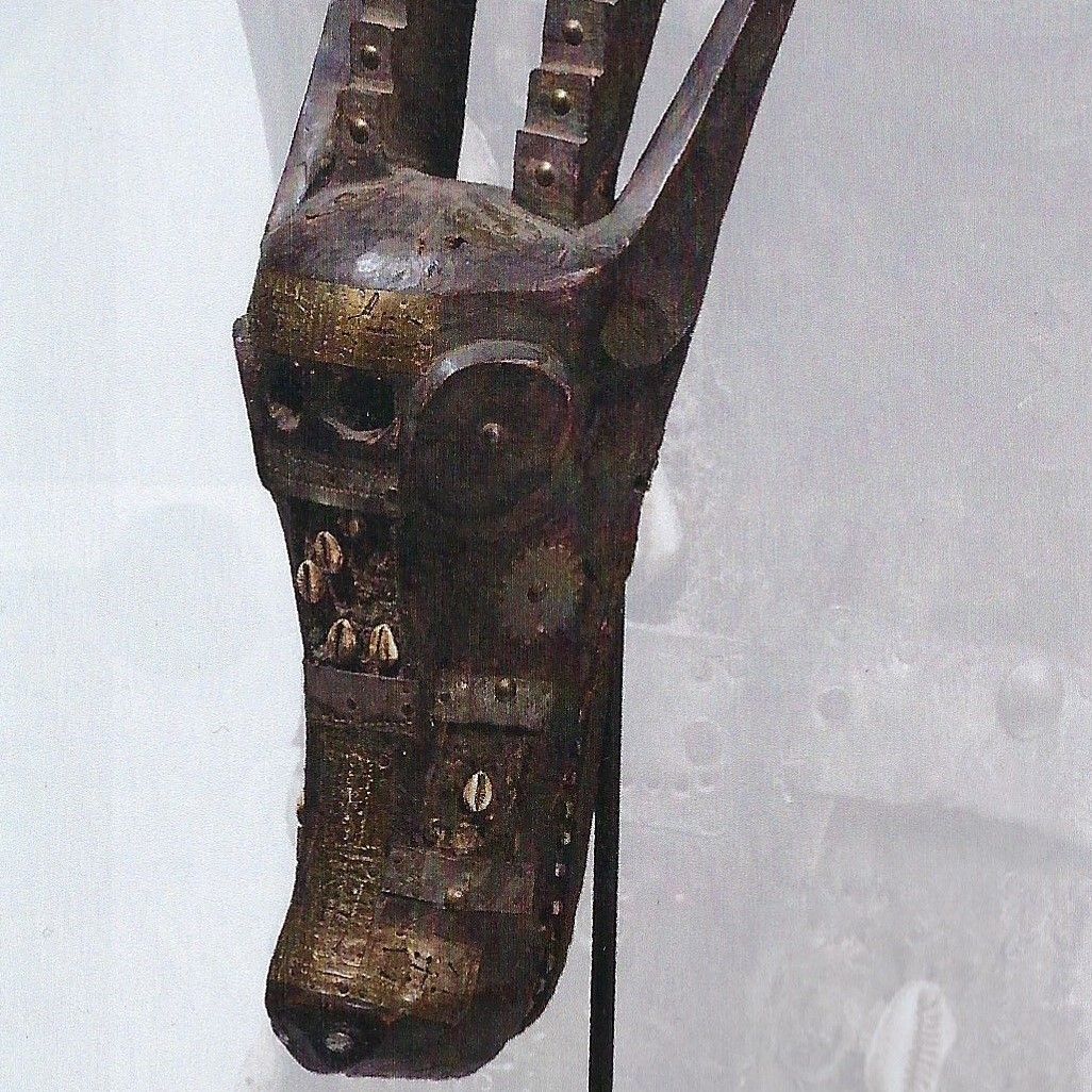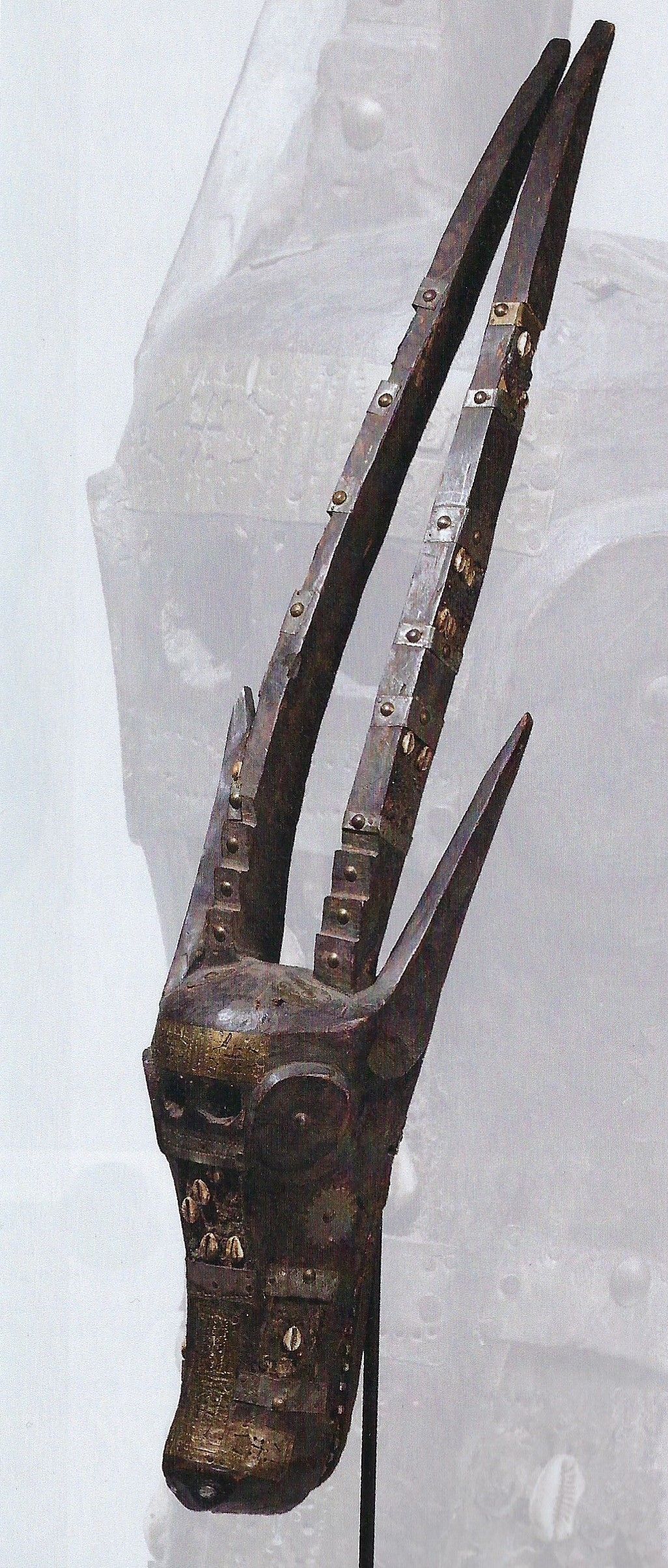 Großer, eindrucksvoller Tanzaufsatz in Form eines Antilopenkopfes mit zwei am Ansatz gezackten, geschwungenen Hörnern und seitlichen Hörnern. Auf der Vorderseite ausdrucksvolle kreisförmige Augen, die Nasenlöcher sowie die Zähne des separat gearbeiteten Unterkiefers aus Metall. Außerdem vorderseitig und an den Hörnern Beschläge aus Eisenblech sowie aus punzierten und durchbrochenen gearbeiteten Messingblech. Die untere Hälfte und die Seiten der Hörner sind zusätzlich mit Kauri Muscheln und Samenkörnern verziert.