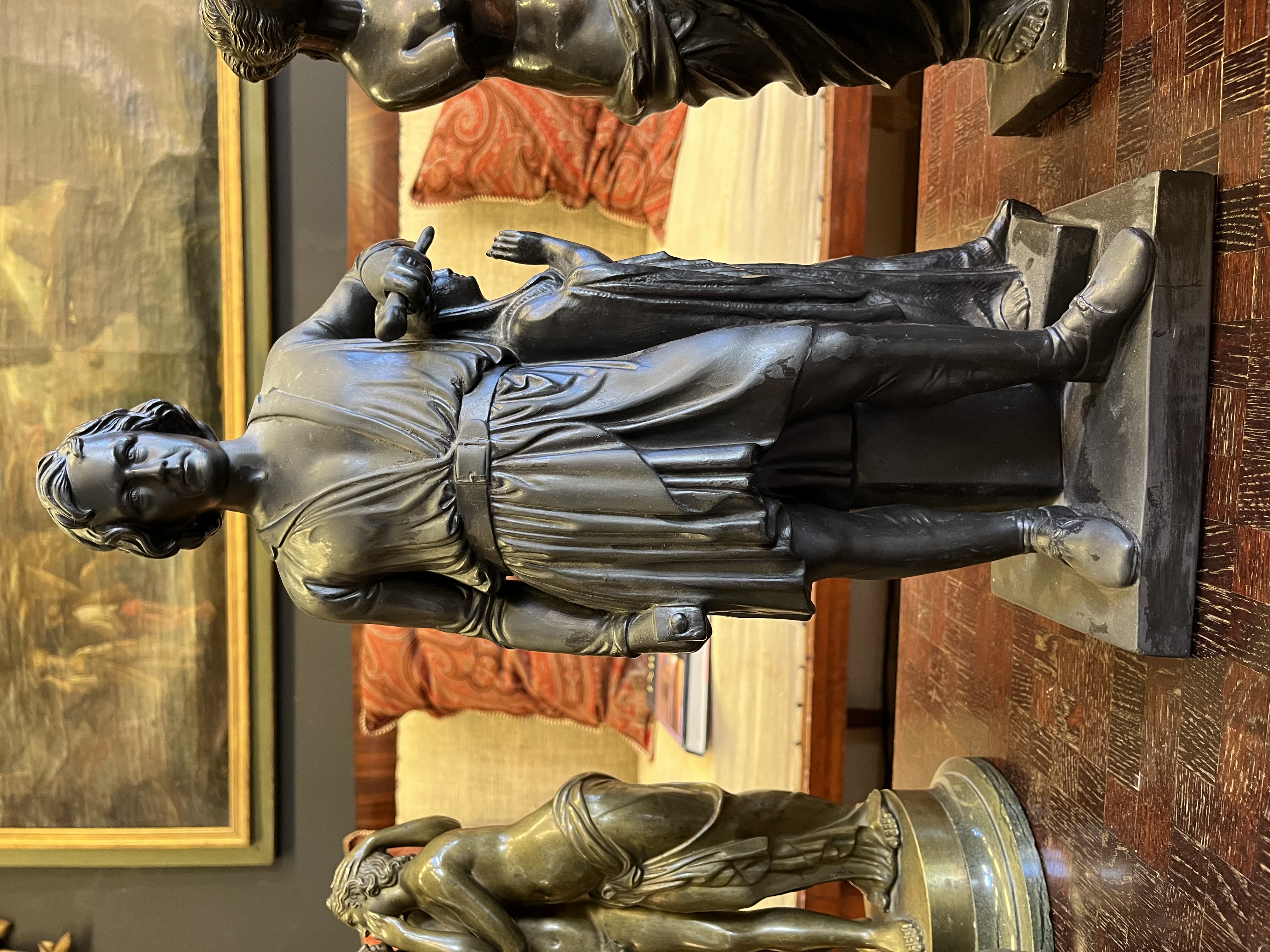 Thorvaldsen (1770 Copenhagen – 1844 Copenhagen) was the hottest superstar among Rome’s sculptors from 1797 onwards, counting kings, nobility, and the upper middle class among his clients. Everyone wanted to own one of his works. In order to cope with the immense volume of commissions, up to forty students and employees were at times busy in his large studio, organized according to a division of labor, creating life-size plaster models based on his designs, which were then reproduced in marble depending on the commission. The master came up with the ingenious idea for the work and the first model in plaster or clay. He did not lend a hand in the execution. Given this system, the boundaries between original, workshop replica, and copy became blurred. The buyers did not care. Depending on their wealth, they were just as happy to buy the second or umpteenth marble version as they were the plaster cast or the bisque porcelain plaque. For his self-portrait, he depicted himself working on the sculpture of the goddess of hope, on which he also leans. His gaze appears determined, and he seems to be taking only a brief creative break until the next brilliant idea comes to him. His mainly Scandinavian, Eastern European, and German buyers did not value his works as virtuoso, ingenious unique pieces, but as an expression of education. The artist’s idea and his affinity for antiquity were the decisive factors. Given the overwhelming demand for his sculptures and reliefs, Thorvaldsen would hardly have had the time to carry out every step of the work himself. With his division of labor in the studio, he anticipated the factories of today’s star sculptors such as Jeff Koons and Damien Hirst.