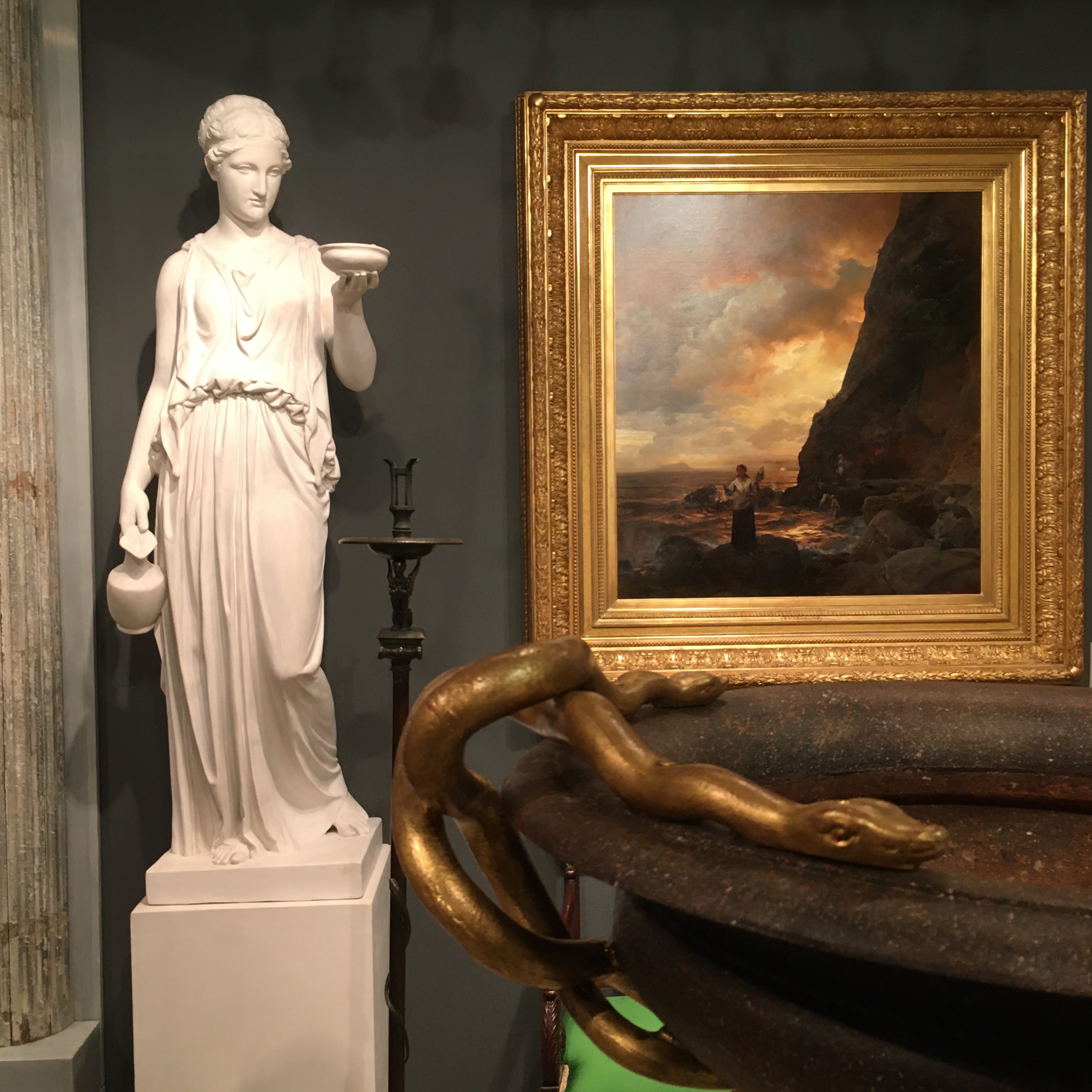 One of Thorvaldsen’s most beautiful sculptures, which perfectly embodies his style, is Hebe, Cupbearer of the Gods, which he conceived in 1816. Hebe expresses what his friend and contemporary Winckelmann postulated as the essence of ancient Greek sculpture, namely “noble simplicity and quiet grandeur.” Hebe, in classical contrapposto, is completely at ease without appearing lifeless and is of noble, idealized beauty. With sculptures like this, Thorvaldsen wanted to directly connect with antiquity and heal what he saw as a break and decline in art since then.