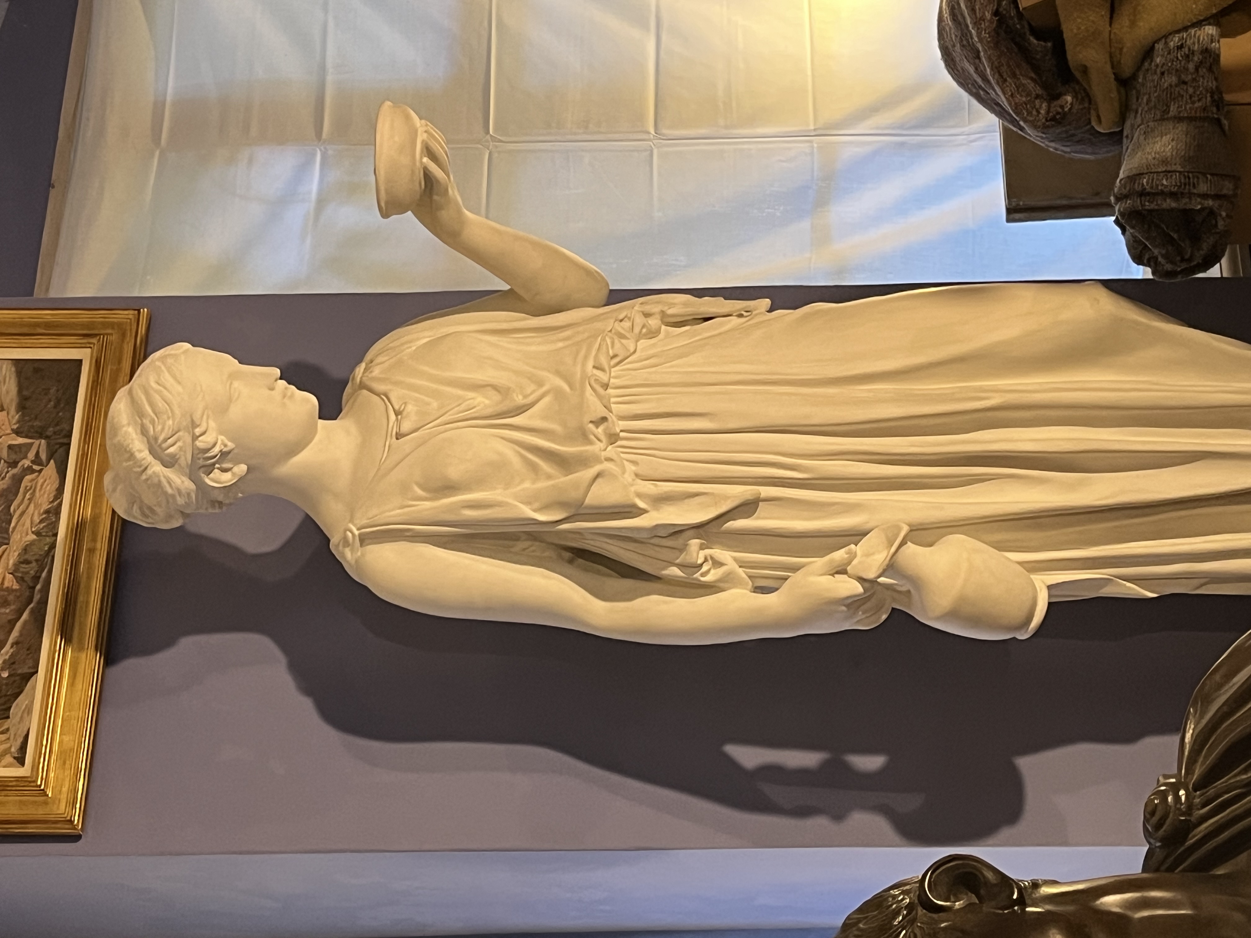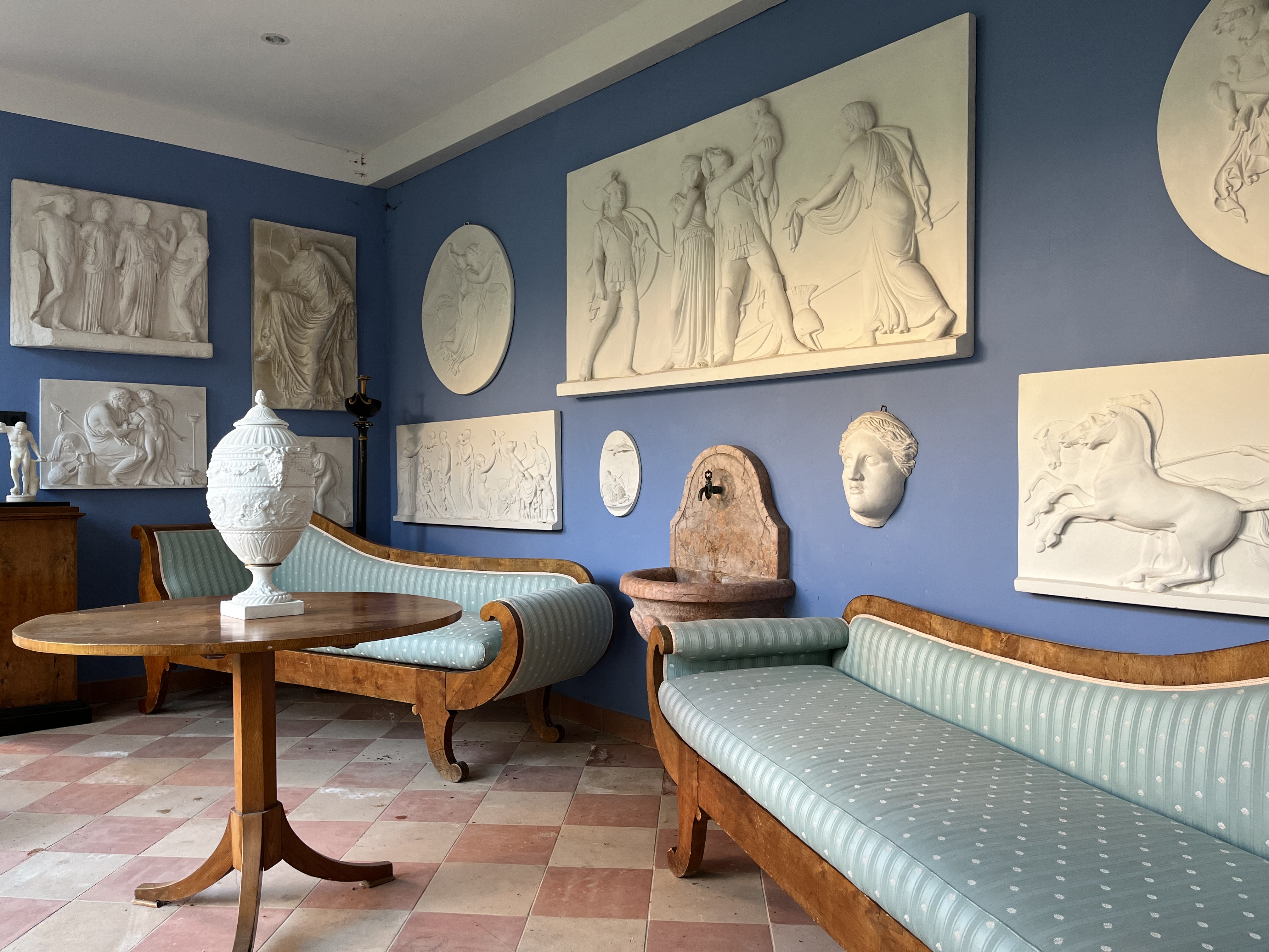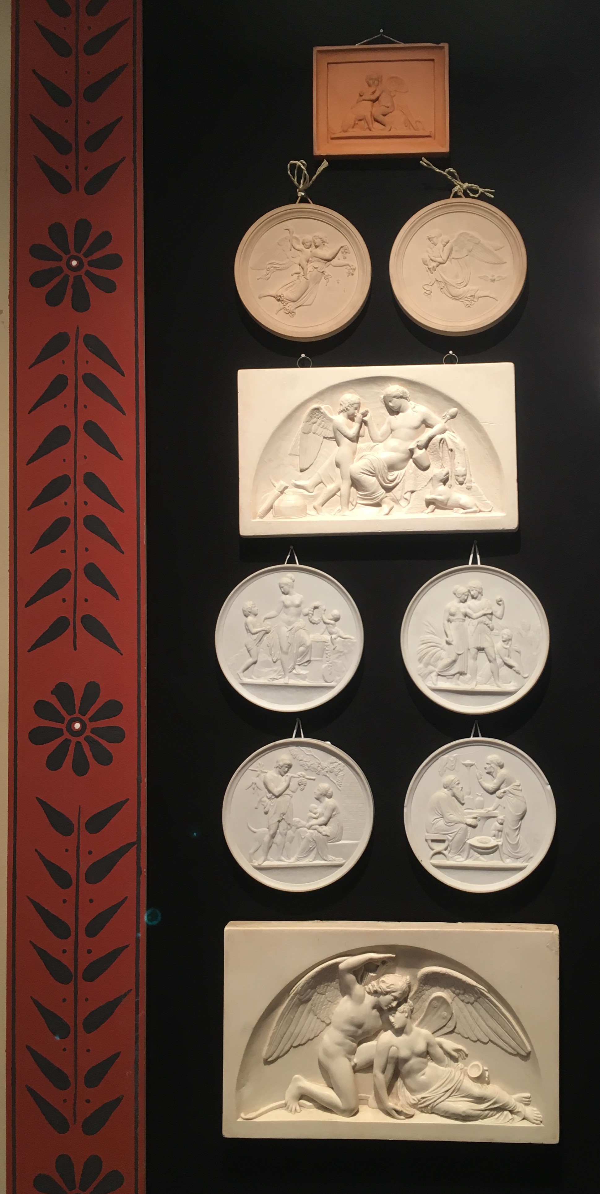 Those who had more space or planned a more prestigious display and hanging in the form of a glyptotheque, which was very popular in the 19th century and still looks magnificent today, purchased “Day” and “Night” in marble or as plaster casts in their original sizes of 78 and 75 cm in diameter, respectively. Mrs. von Humboldt confessed to a friend that she would have loved to have had the marble version, but was too poor and therefore opted for plaster. Her tondi can still be admired today at Tegel Palace in Berlin. In the Sculpture Gallery at Chatsworth House in Derbyshire, one of the few surviving original installations (and the setting for a scene in the latest Jane Austen film adaptation of “Pride and Prejudice” starring Keira Knightley), ‘Day’ and “Night” in marble hang alongside parts of Thorvaldsen’s Alexander frieze.