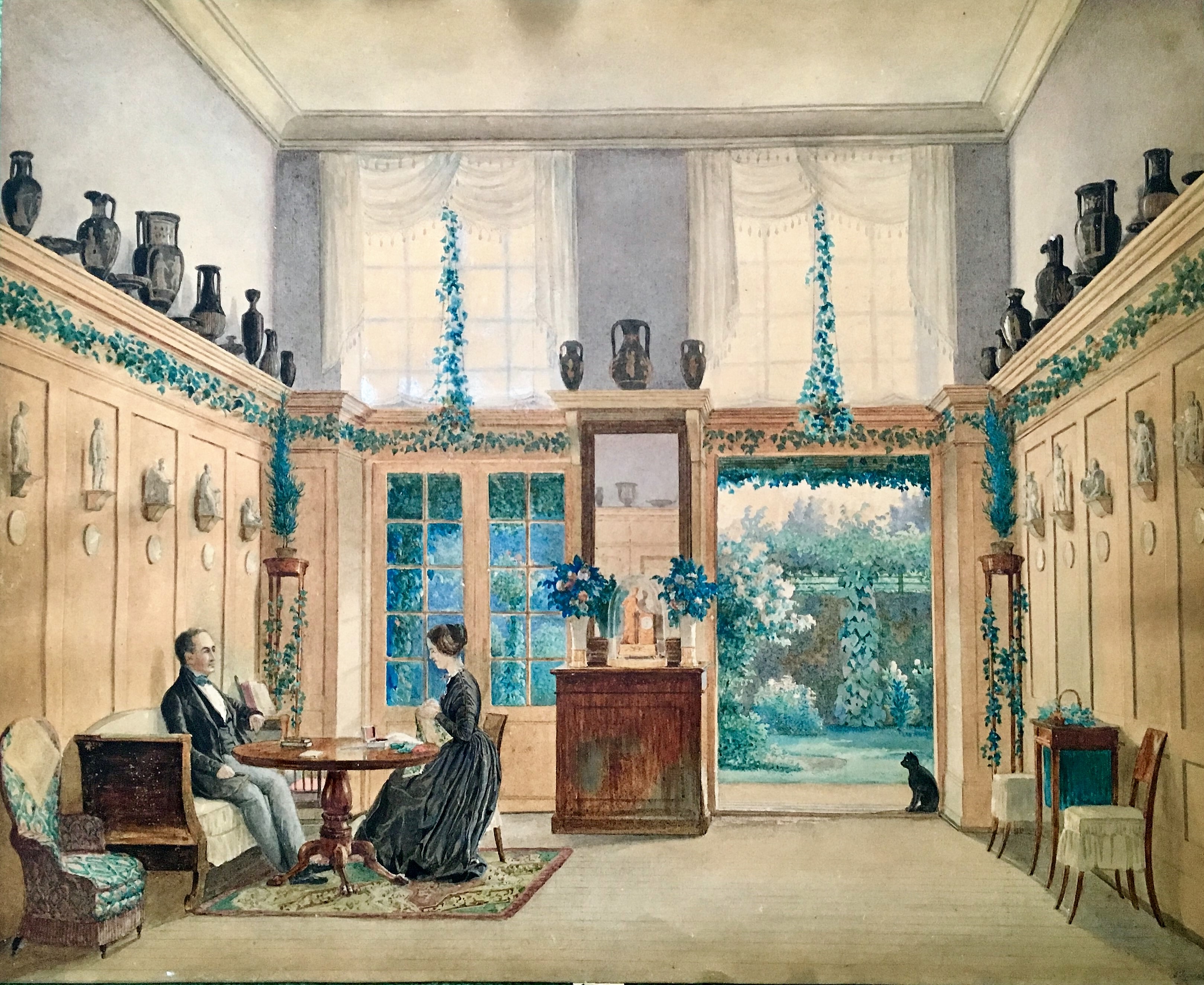 The Royal Copenhagen Porcelain Manufactory began in the 1820s and, with the artist’s authorization, began producing larger editions of bisque figures and reliefs. The rough, marble-like surface of bisque porcelain corresponded to the classicist taste, which was influenced by ancient sculpture. The small-scale format now allowed wealthy citizens to acquire works of art by the famous sculptor and demonstrate their education. The bestsellers were the relief tondi “Day” and ‘Night’ (plaster model from 1815, Thorvaldsen Museum, Inv. No. A369 and A370), followed by the four seasons and “Who Buys Love Gods.” The extraordinary sales success of the 11 cm porcelain version of “Day” and “Night” produced in 1840 – 2,100 copies in the first year – led to an expansion of the range and attracted competitors. One of the modelers, Frederik Wilhelm Gröndahl, joined forces with book and art dealers Jacob Hermann Meyer and Hermann Bing in 1852 and founded the Bing & Gröndahl manufactory in 1854. The watercolor by their porcelain painter, Andreas Juuel, shows how the plaques, reliefs, and small sculptures made of bisque porcelain were presented in bourgeois interiors. With Ibsen and Hjorth, other manufacturers joined in during the 19th century, reproducing Thorvaldsen’s sculptures and reliefs in porcelain or terracotta. After the artist’s death, the Thorvaldsen Museum in Copenhagen, which owns his estate, took over the authorization (Eneret).